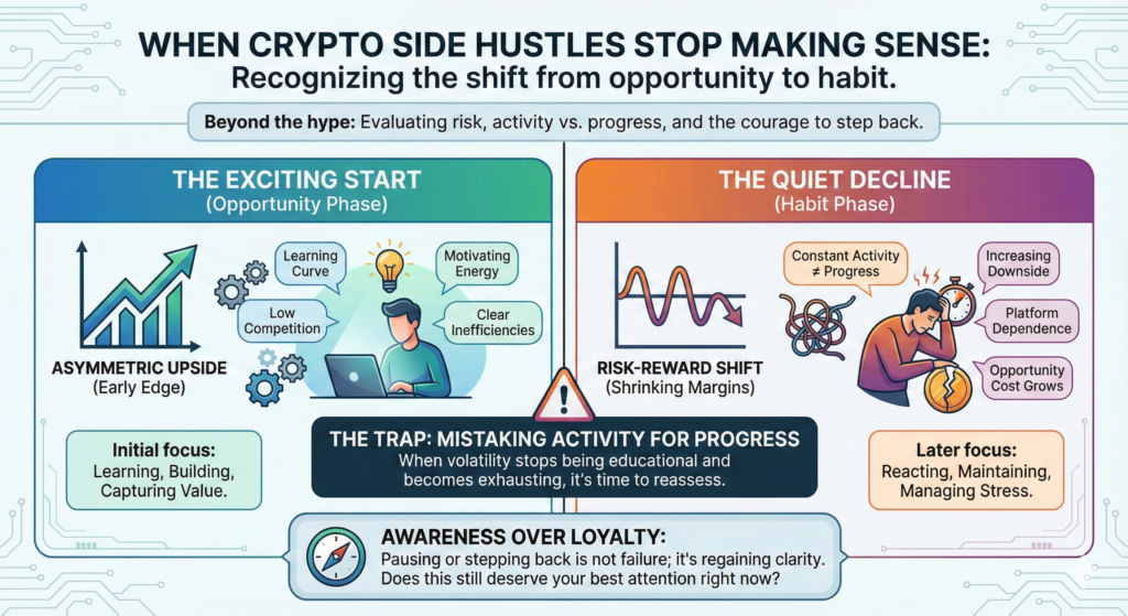 This article is not about quitting crypto altogether. It’s about understanding when a crypto-related side hustle stops making sense, and how to evaluate that moment without panic, ego, or sunk-cost thinking.