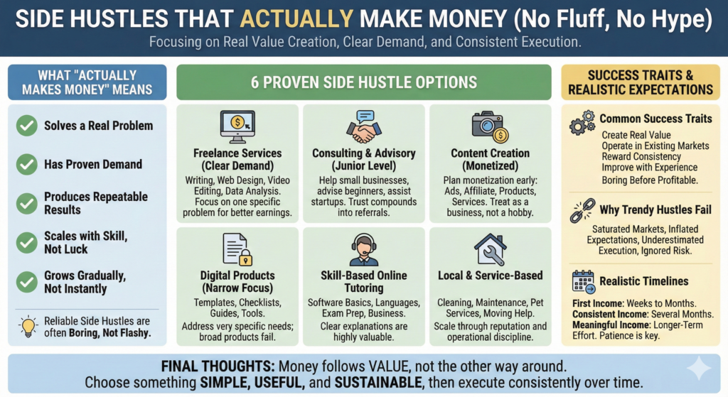This article focuses on side hustles that actually make money, without hype, unrealistic promises, or shortcuts.